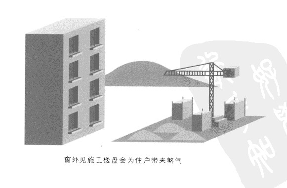 大廈對出的位置正有樓盤施工的話,正值搭棚時煞氣便最大,因為有萬箭穿心之象,對整幢大樓皆有影響;而在施工期間,所建筑的層數愈近自己所住的樓層,影響便愈大——例如當建筑到五樓,自己所住大廈的十至十五樓的問題便最為嚴重,如此類推。